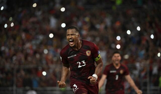 El delantero venezolano Salomón Rondón celebra marcar el primer gol de su equipo durante el partido de fútbol de las Eliminatorias Sudamericanas para la Copa Mundial de la FIFA 2026 entre Venezuela y Paraguay, en el estadio Monumental de Maturín, Venezuela, el 12 de septiembre de 2023. (Foto de Yuri CORTEZ / AFP)