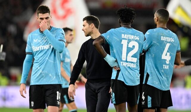El entrenador español del Bayer Leverkusen, Xabi Alonso (2.o por la izquierda), habla con sus jugadores después del partido de fútbol de la primera división de la Bundesliga alemana entre el VfB Stuttgart y el Bayer Leverkusen en Stuttgart, sur de Alemania, el 10 de diciembre de 2023. (Foto de THOMAS KIENZLE / AFP) / DFL LAS REGULACIONES PROHÍBEN CUALQUIER USO DE FOTOGRAFÍAS COMO SECUENCIAS DE IMÁGENES Y/O CUASI-VIDEO – LAS REGULACIONES DEL DFL PROHÍBEN CUALQUIER USO DE FOTOGRAFÍAS COMO SECUENCIAS DE IMÁGENES Y/O CUASI-VIDEO
