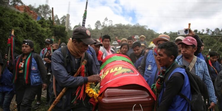 Portadores del féretro cargan el ataúd que contiene los restos del líder regional indígena Fredy Campo Bomba, en Caldono, Colombia, el sábado 29 de julio de 2023.