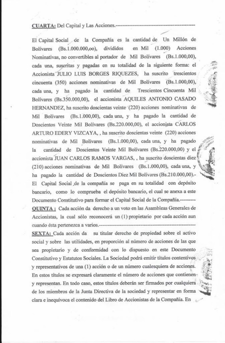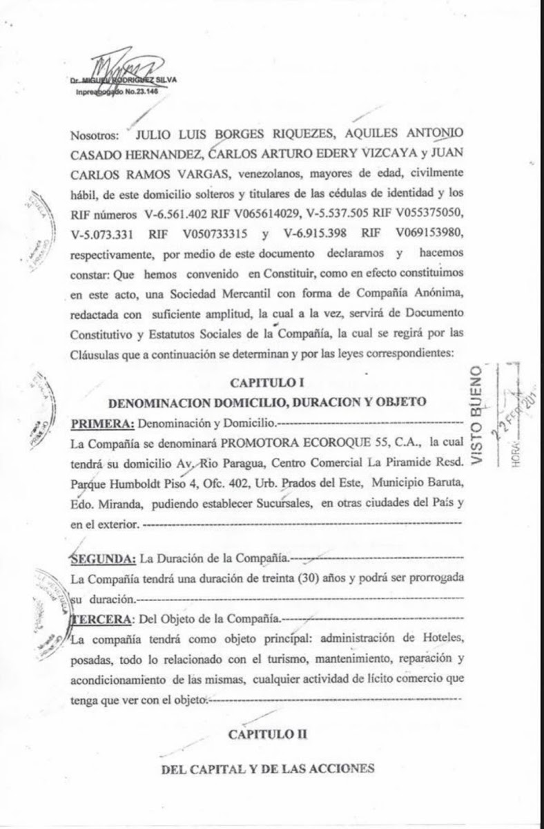Entre los nombres vinculados a la polémica “Constructora Eco Roques C.A” se encuentran Julio Luis Borges Riquezes, Aquiles Casado Hernández, Carlos Edery Vizcaya y Juan Carlos Ramos Vargas, quienes según documentación oficial, ostentan la posición de accionistas. Borges Riquezes no es ajeno al mundo de los bienes raíces, con antecedentes que lo conectan a «Incapin Inversiones de Capital Inmobiliario C.A.» hasta el año 2013 y posteriormente a «Tembo Global Investment S.L» en España, empresa registrada el 6 de julio de 2017 y que, tras cambios administrativos, presenció la dimisión de Federico De La Lastra Camacho el 14 de marzo de 2019.