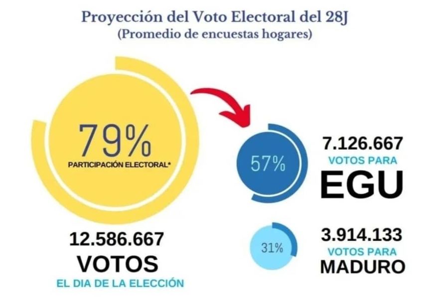 Según esto, 57% (7.126.667) de los votos serían para Edmundo González Urrutia y 31% (3.914.133) para Nicolás Maduro. Sobre el entusiasmo y el deseo de cambio en el país da cuenta el respaldo masivo que reciben las giras políticas de María Corina Machado y los actos en los que participa junto a Edmundo González Urrutia.