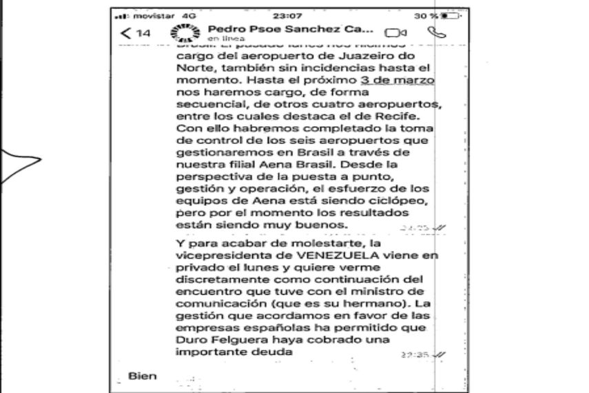 Ábalos envió a su asesor, Koldo García, una conversación (una captura de pantalla) que había tenido con el propio Sánchez por mensaje a las 23:07 horas del 16 de enero de 2020. «La vicepresidenta de Venezuela viene en privado el lunes y quiere verme discretamente como continuación del encuentro que tuve con el ministro de Comunicación, que es su hermano. La gestión que acordamos en favor de las empresas españolas ha permitido que Duro Felguera haya cobrado una importante deuda», le dijo el ministro a Sánchez, quien respondió con un escueto «bien» a la información.