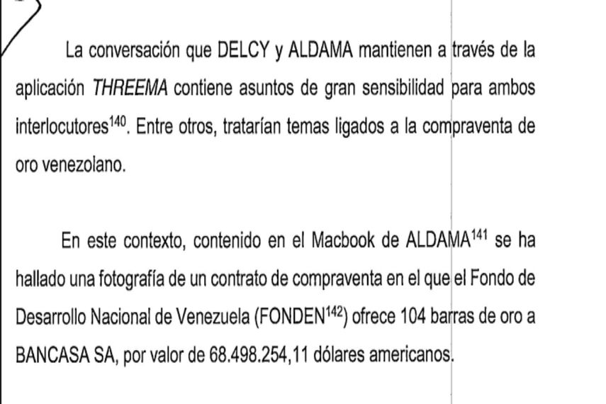 La investigación confirma la existencia de negociaciones entre Rodríguez y Aldama para la venta de 104 barras de oro valoradas en 68,5 millones de dólares a la empresa BANCASA SA, mediante un contrato facilitado por el Fondo de Desarrollo Nacional de Venezuela (FONDEN). Se ha señalado que el monto de esa mercancía era mayor al pactado en los contratos y que la diferencia por el valor real de mercado fue negociada entre los involucrados.