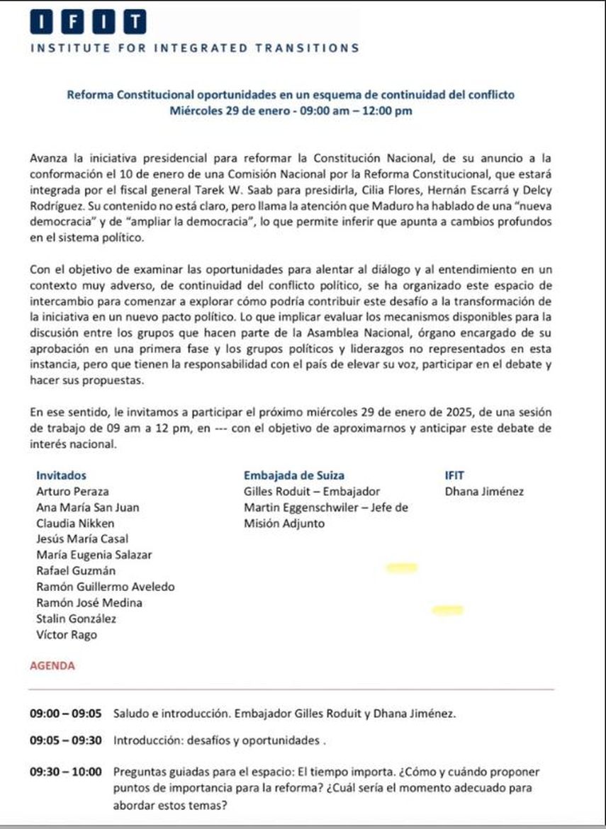CARACAS.– En una iniciativa sin precedentes en Venezuela, el Instituto de Transiciones Integradas y la embajada de Suiza convocaron a través de un comunicado a un debate sobre el proyecto de Reforma Constitucional que adelanta el régimen de Maduro, el cual se realizará el 29 de enero en la residencia del embajador Gilles Roduit, en Caracas.