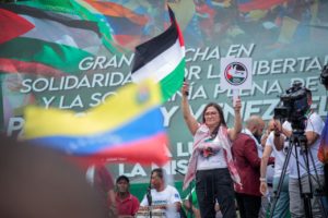 Están presentes el jefe de Gobierno de Caracas, Nahum Fernández; la alcaldesa de Caracas, Carmen Meléndez; el rector de la Universidad Nacional de las Comunas, Jorge Arreaza; y la diputada a la Asamblea Nacional, Blanca Eekhout, quien exclamó que en Palestina «se juega la vida de la humanidad», y que «el mundo unipolar liderado por Washington pretende imponerse a partir del exterminio de los pueblos».