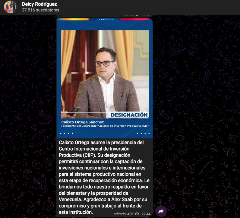«Calixto Ortega asume la presidencia del Centro Internacional de Inversión Productiva (CIIP). Su designación permitirá continuar con la captación de inversiones nacionales e internacionales y para el sistema productivo nacional en esta etapa de recuperación económica», escribió la mandataria en sus redes sociales.