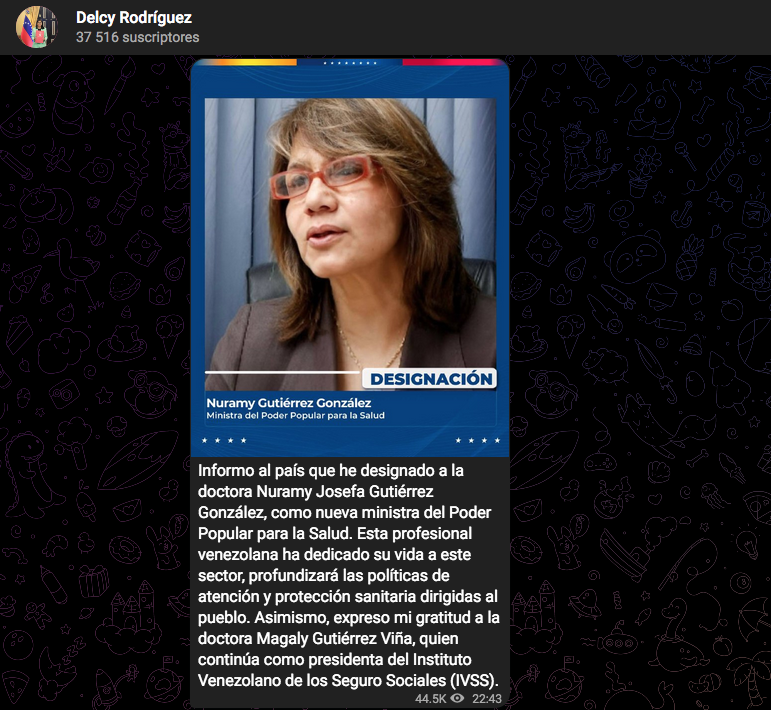 «Informo al país que he designado a la doctora Nuramy Josefa Gutiérrez González, como nueva ministra del Poder Popular para la Salud. Esta profesional venezolana ha dedicado su vida a este sector, profundizará las políticas de atención y protección sanitaria dirigidas al pueblo», escribió.
