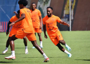 John Yeboah (c) en el entrenamiento de Ecuador en la Casa de la Selección, en Quito. Foto: Marcelo Gallo Oña...