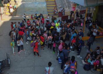 MEX3881. TAPACHULA (MÉXICO), 05/12/2023.- Migrantes dialogan con autoridades mexicanas cerca de una estación migratoria hoy, en la Ciudad de Tapachula...